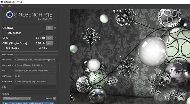 我分別使用了CINEBENCH R15和R20對這顆處理器的單核、多核性能進行了評估,在R15測試體系中,這顆處理器單核得分138cb,多核621cb,單核分數(shù)受最大睿頻影響相對來說相對低一點,但多核分數(shù)基本與英特爾第八代酷睿i7 U系列處理器相仿。