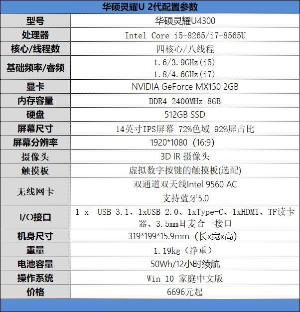 本次我們測試的產品為靈耀U 2代,其配置參數如下: