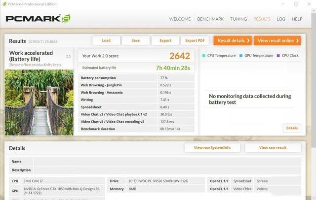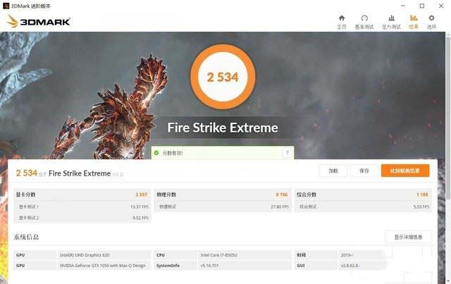 圖形測試部分我們選用3DMARKFireStrikeExtreme進行了測試,2534分的成績放在商務類筆記本產(chǎn)品中肯定是屬于很高的水平了,相比于常見的MX150獨顯領先了接近一倍,這也就讓微星PS63 Modern的圖形性能能夠勝任更多相關場景的應用,比如在支持硬件加速的軟件中性能表現(xiàn)會更好。