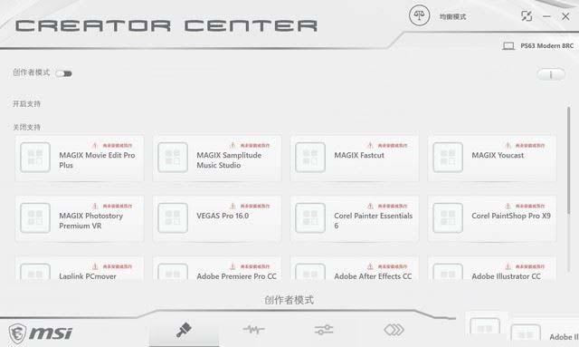 首先是MSICreator Center,首次打開軟件時會提醒我們打開創(chuàng)作者模式,打開后可以看到軟件平臺提供了對眾多專業(yè)設計類軟件的支持,專業(yè)性非常高。