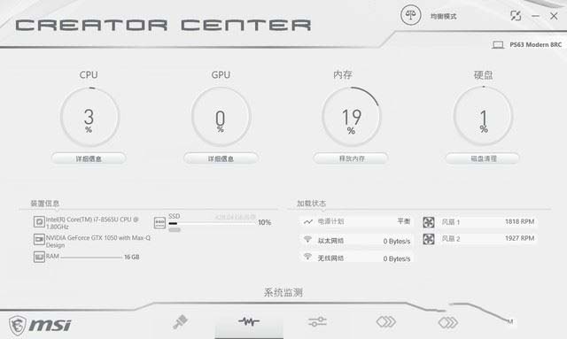 在MSICreator Center的第二頁能夠看到系統(tǒng)硬件的運行情況與配置信息,這在其他品牌產(chǎn)品的控制中心也能見到類似的,但微星做的要更加精致豐富一些,信息羅列也更加直觀。