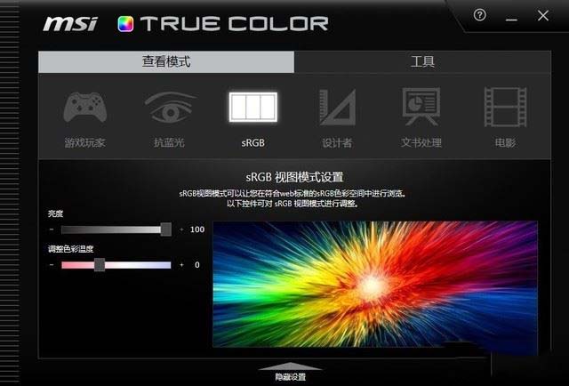 然后是MSITrueColor,這款軟件專為設計師人群設計,能夠?qū)崟r調(diào)整亮度、色溫選項,并有多個預設模式,工具中也有更多功能提供給用戶,這些軟件都體現(xiàn)出了微星PS63 Modern的專業(yè)設計屬性。