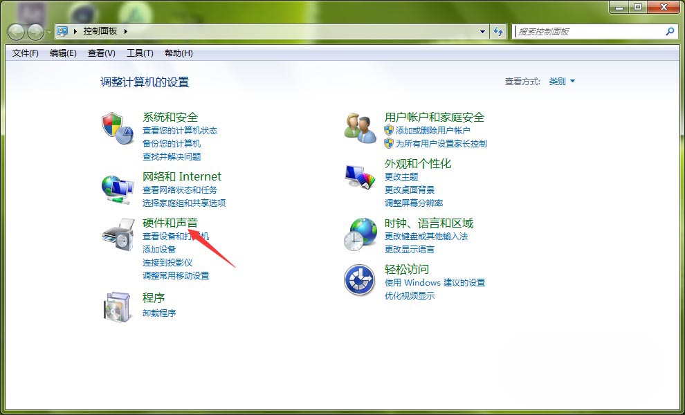 3、在打開的控制面板中,點擊打開【硬件和聲音】