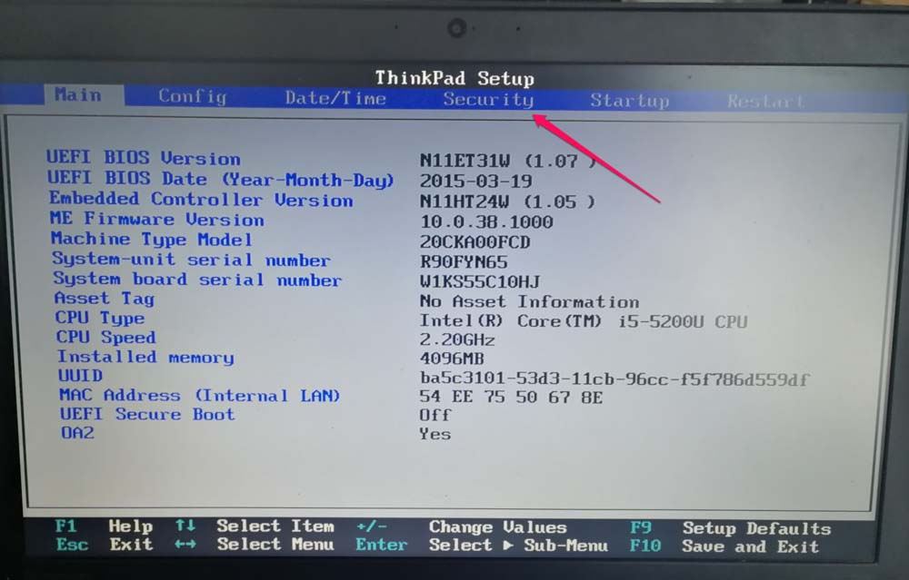 2、按住F2鍵之后我們就會進入到bios的設置界面了,這里我們按照下圖中紅色箭頭指示位置點擊“Security”,如下圖: