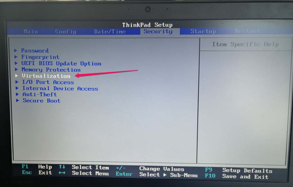 3、在“Security”界面我們還是按照中紅色箭頭指示位置點擊“Virtualization”,這個選項就是我們要找的虛擬化選項,然后進入,如下圖: