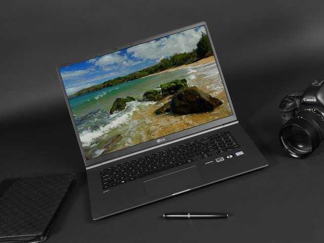 筆者拿到的這款LG gram 17Z990筆記本為深灰色,細節為磨砂,據了解17Z990還有一款白色的。納米碳鎂合金材質的手感摸起來并不細膩,但是這種材料能夠讓整機重量降到1340g,拿起來非常輕松。1340g是什么概念?這依然是目前很多13、14英寸筆記本的重量,而1340g也讓17Z990成為目前最輕的17英寸筆記本電腦,便攜性超級強。