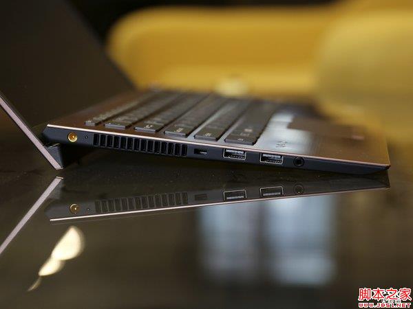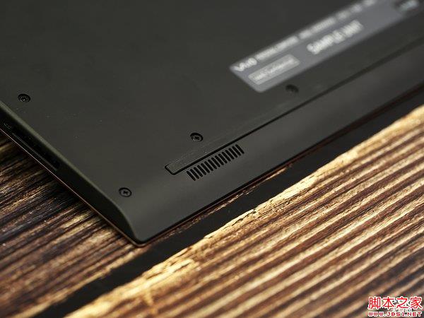 筆記本的D面是一整塊完整的板材,除了底部兩個揚聲器外沒有看到任何一個開口,即便是進風口,那這款筆記本進風口在哪。我端著筆記本找了一圈,終于在筆記本C面頂端找一排進風,進風口隱藏筆記本B面和鍵盤面的結合處,風扇通過進風口吸進來的冷風也正好能夠形成風道,被動冷卻CPU以及周邊區域,提升了筆記本一體性的同時增強散熱風道,是個非常巧妙的設計。