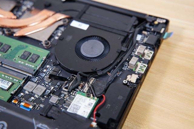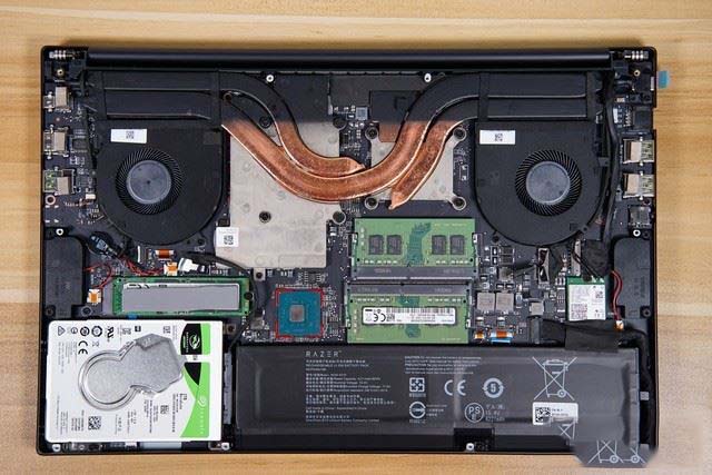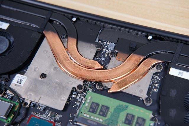 打開底蓋可以看到三銅管雙風扇的散熱方案,這也是時下不少游戲本所選擇的標準散熱方案,不過雷蛇靈刃15標準版的散熱銅管面積更大、更粗,使得散熱效率得到更好的保障。