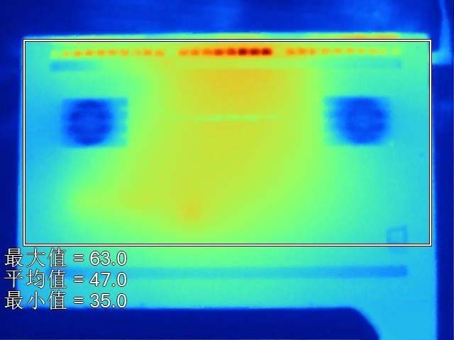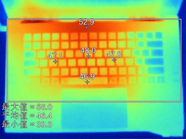 通過熱成像儀我們可以看到雷蛇靈刃15標準版的C面和D面溫度。C面鍵盤區域平均溫度46.4℃,略高,而且由于發熱元件主要集中在鍵盤中間區域,并且受到熱量向周圍發散的影響,因此手部能夠感覺到熱量。