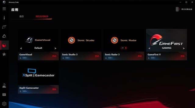 還有一點(diǎn)值得一提,那就是Armoury Crate居然有“應(yīng)用商店”。可以將這部分理解為擴(kuò)展插件,通過(guò)插件實(shí)現(xiàn)更多功能。比如系統(tǒng)內(nèi)已經(jīng)安裝了GameVisual,這是控制顯示的程序,可在多種顯示模式(FPS模式、RTS/RPG模式、影院模式等)之間切換;GameFirst則是控制網(wǎng)絡(luò)的程序,可以保證游戲優(yōu)先使用網(wǎng)絡(luò)。這部分功能支持自主下載擴(kuò)展,相比此前預(yù)裝的做法更加自由、可玩性更高。