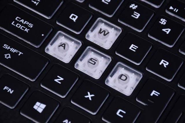 鍵盤方面,除了支持四分區(qū)全彩RGB背光外,其手感也相當(dāng)出眾。ROG槍神2s Plus的“WASD”四個(gè)按鍵采用了透明鍵帽,鍵腹采用曲線設(shè)計(jì),貼合指腹,并且全鍵無(wú)沖。按鍵鍵程1.8mm,按壓力度中等,回彈比較有力,手感較為出色。