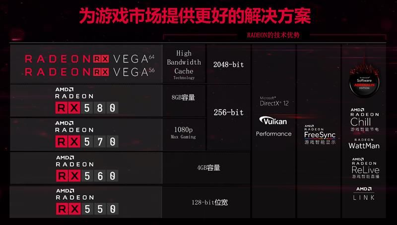 在GPU進入14nm工藝時代之后,AMD發布的產品從入門級的 RX 550到一直到旗艦級的Vega64,整個Radeon的產品線都得到了更新。