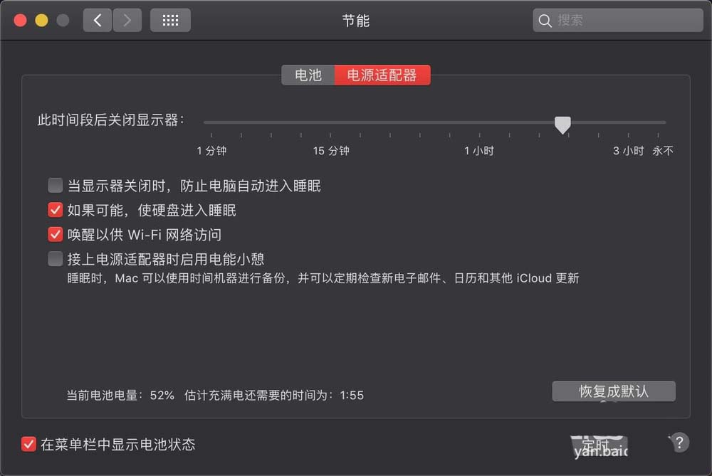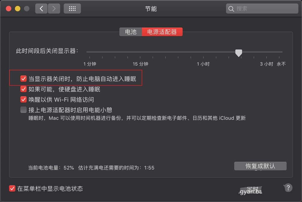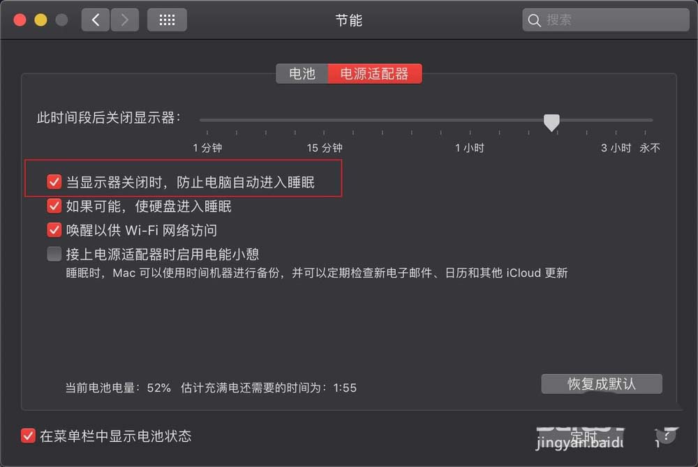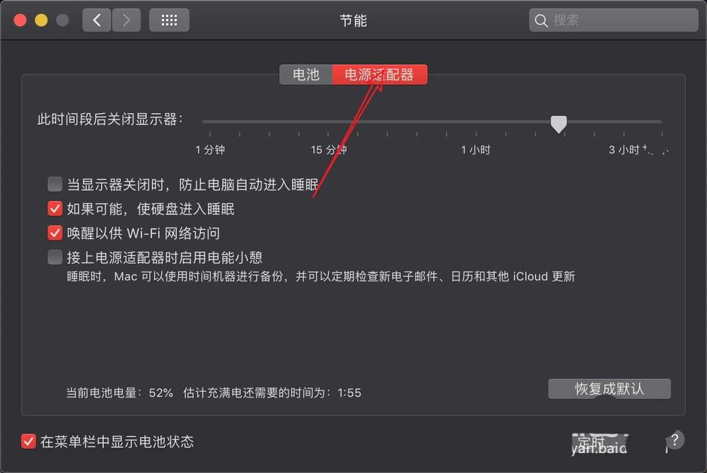 2、點擊【電源適配器】,點擊【當顯示器關閉時】。