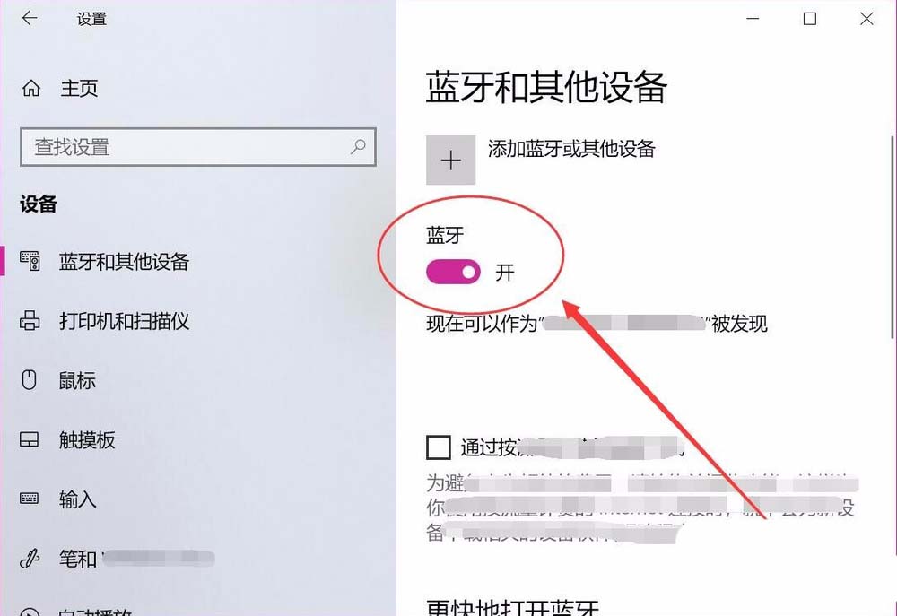 3、藍牙和其他設備窗口中,將藍牙功能打開。