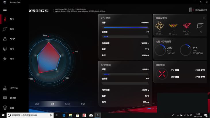 每一款具有一定設計特色的游戲本都會有一個配套的控制軟件用來調整頻率、風扇、燈效等設置,玩家國度自然也不例外。但是之前玩家國度的軟件設計風格太“工程師”,雖然功能齊全,但是并不好用。而今,冰刃 3 中預裝了全新的Armoury Crate 軟件,它給筆記本帶來了更多的可玩性。