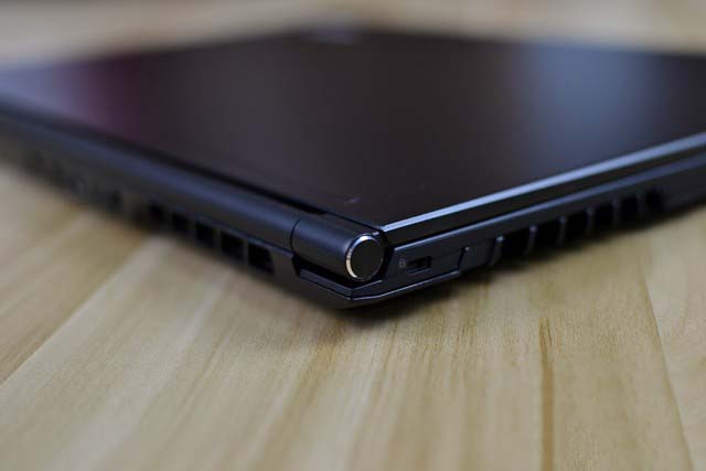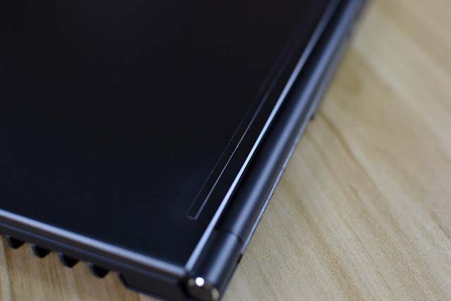 在轉(zhuǎn)軸右側(cè)位置有三個(gè)指示燈,分別為大寫鎖定指示燈、充電指示燈和電源指示燈,無(wú)論開合狀態(tài)下都能看到,這一設(shè)計(jì)還是非常不錯(cuò)的,方便用戶第一時(shí)間了解筆記本情況。