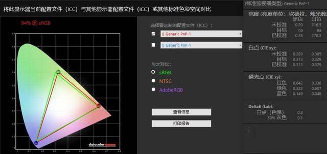 筆者使用Spyder5 Elite對(duì)這款屏幕進(jìn)行測(cè)試,最終得到色域數(shù)值為:94% sRGB、68% NTSC,屏幕亮度為316尼特。從測(cè)試數(shù)據(jù)來(lái)看,這是一款廣色域屏幕,色域和亮度表現(xiàn)都非常出色。