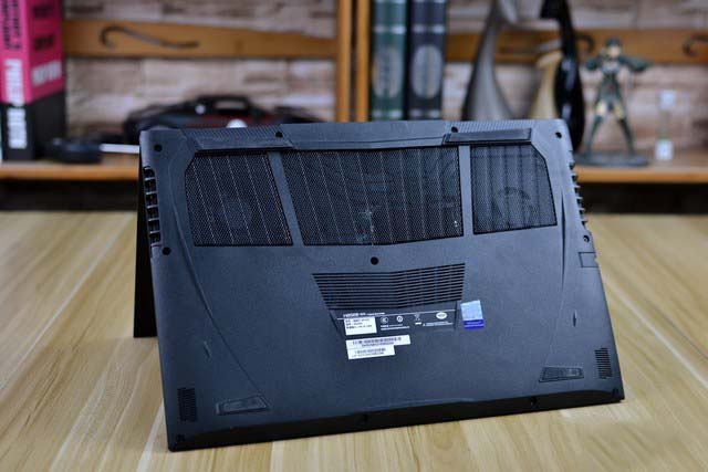 當(dāng)你注意到側(cè)面、后側(cè)和底部的時(shí)候,或許你能找到一點(diǎn)答案。神舟戰(zhàn)神Z7-KP7GZ擁有四個(gè)出風(fēng)口,而且從出風(fēng)口能夠看到密密麻麻的散熱鰭片。底部更加夸張,進(jìn)風(fēng)口鏤空區(qū)域非常大,大約占據(jù)了底部的三分之一。同時(shí)透過(guò)金屬隔網(wǎng)可以看到雙風(fēng)扇四熱管的散熱模組,實(shí)測(cè)散熱成績(jī)非常給力,后面會(huì)詳說(shuō)。