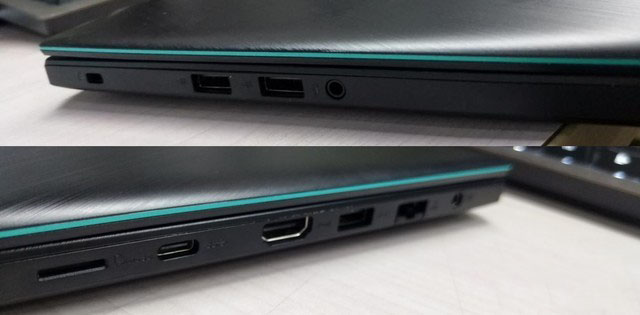 華碩頑石YX570在A面和C面都采用了拉絲紋路設計。不過相比傳統的單向拉絲紋路,華碩采用了多個不同方向拉絲,在同一個平面拼接起來的設計。這樣被華碩稱為“鋒刃紋路”的設計,我們曾經在ROG的Zenphyrus西風之神頂級游戲本中看到。當然由于價格差異,Zenphyrus上的頂蓋是金屬的,紋路處理也更加精致。不過放在一起就可以發現有異曲同工之妙,華碩可能也希望在設計上賦予出頑石熱血版一定的游戲基因。