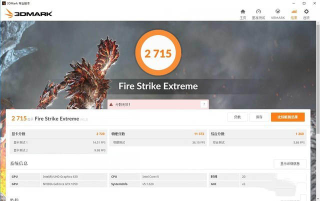 在3DMARK FSE模式圖形基準測試中,光影精靈傲騰版得到了2715分,圖形性能方面屬于GTX1050的標準水平,而物理分數比較出色,相比于i7-7700HQ大約有10%~15%的提升,非常顯著。