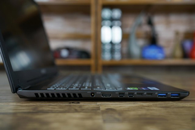 機身接口的種類和數量可以說是神舟精盾T96E的亮點之一,左側除了一個出風口外,右邊密密麻麻分布了大量接口,從左到右分別是電源接口、HDMI、2xMini DP、2xUSB3.1 Type-C以及2x標準USB 3.1,其中最右側的標準USB 3.1接口還支持關機充電。