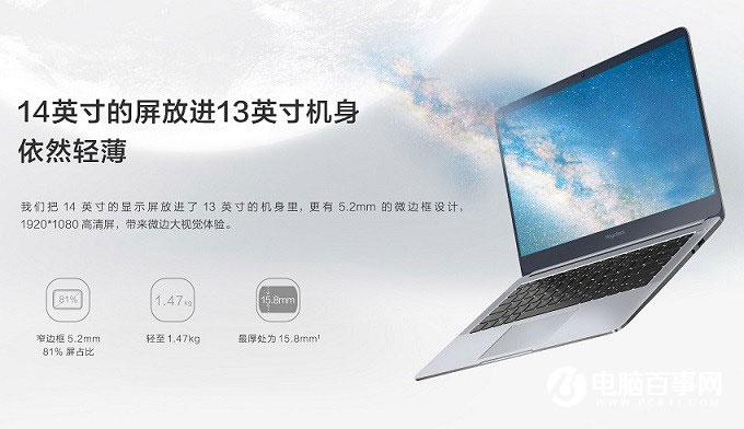 榮耀MagicBook筆記本邊角圓潤,外觀簡約大氣,屏幕邊框約為5.2毫米,屏占比達到81%,在目前筆記本電腦之中屏占比已經算是十分高的了。