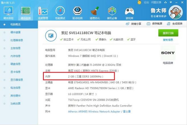 首先,在給老筆記本升級內存之前,可以先在電腦中安裝個魯大師,然后通過“硬件檢測”看看,目前筆記本使用的是哪種品牌的內存,此外還可以看到當前使用的內存是DDR3標壓還是DDR3L低壓版,如下圖示。