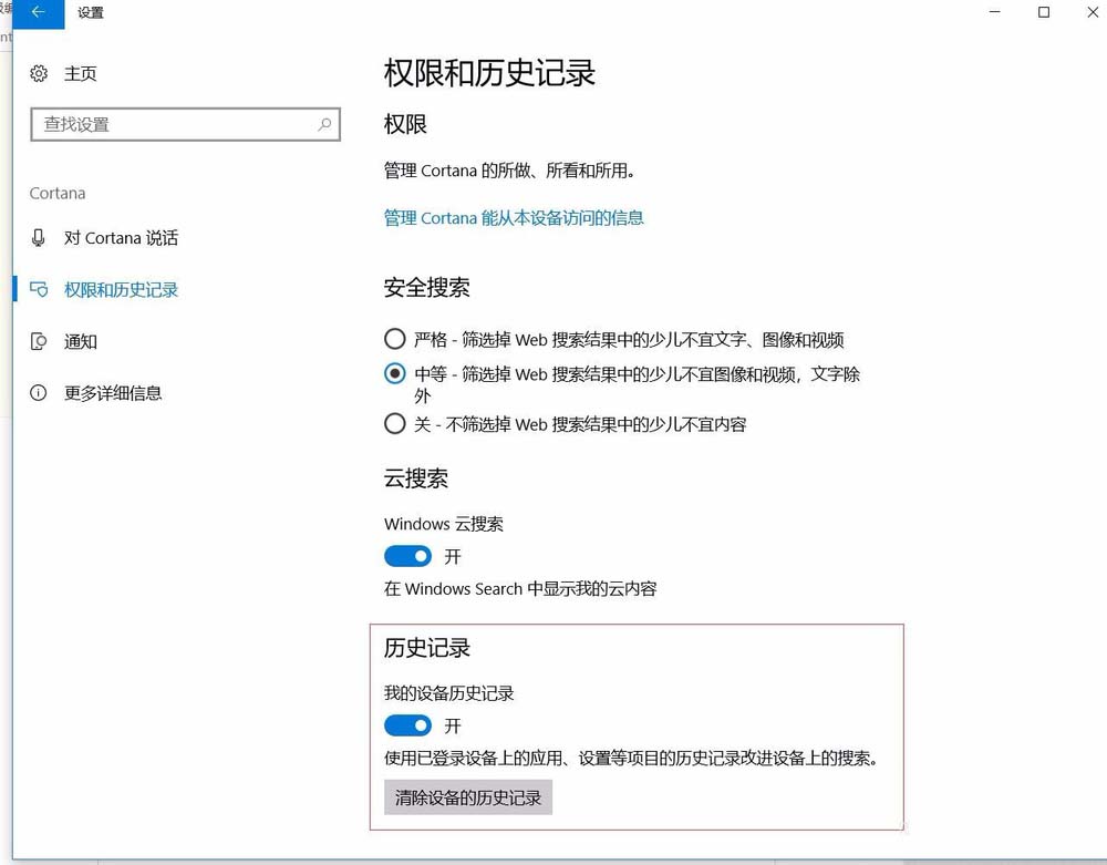 6、進入到權限和歷史記錄之后,找到歷史記錄,歷史記錄下默認是打開我的設備歷史記錄的,選擇清除設備歷史記錄即可清除掉記錄信息,將設備歷史記錄開關關閉,之后所產生的操作將不會被記錄,如下: