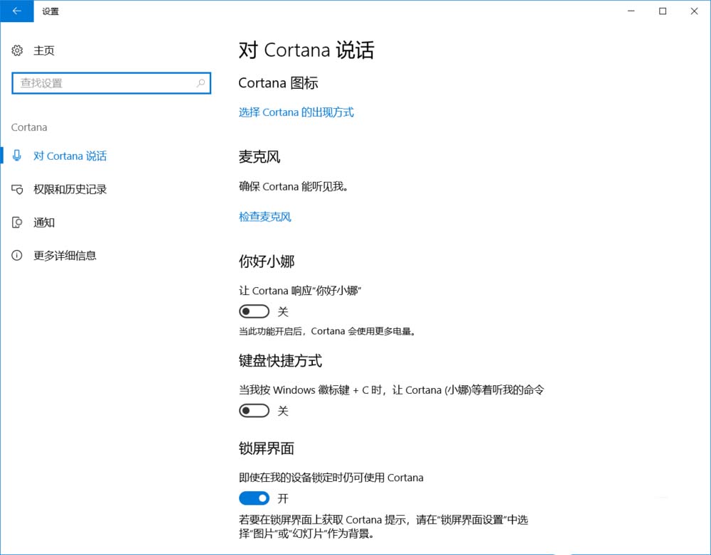 4、找到設置最后一排,點擊cortana,可以設置其相關的語言,通知和權限相關,如下: