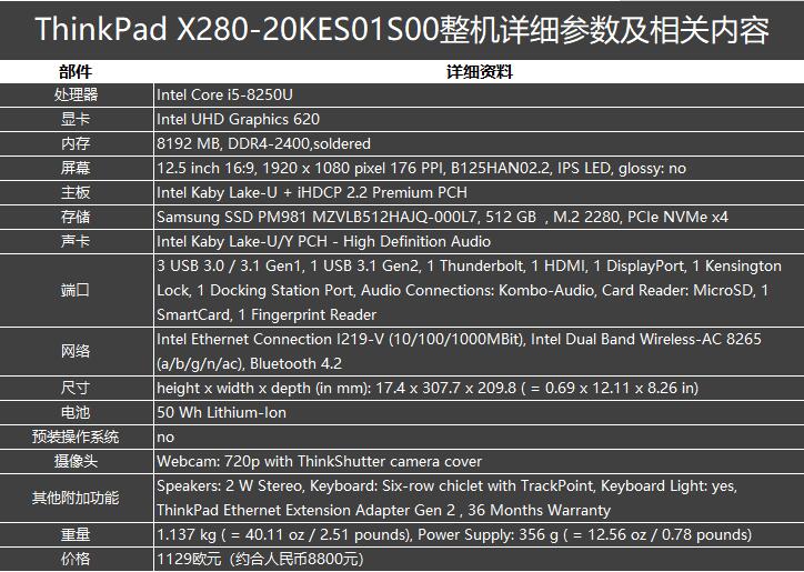 我們拿到的是校園特供的X280,現在還不能在市場上買到。這款機器的配置是FHD的IPS屏幕、8G內存、i5-8250u處理器、512G固態硬盤,未預裝操作系統,價格是1129歐元(人民幣8806元)。在聯想商城中,預裝Windows、相似配置的電腦售價為1655歐元(人民幣12909元)。