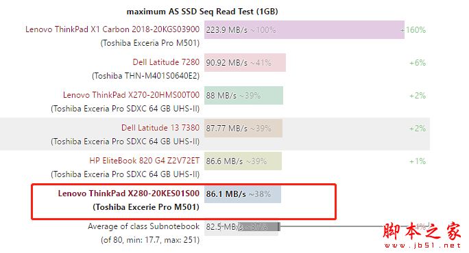 使用東芝Exceria Pro M501的測試結果只是平均水平,X1C 2018的讀寫速度要快上很多。