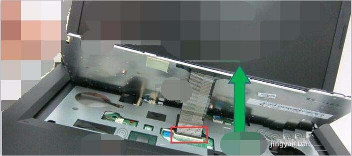 6、同樣的方法直到整個(gè)鍵盤脫離筆記本下邊框,然后往上一抬鍵盤就下來了,接著根據(jù)圖示將連接鍵盤排線的卡扣將排線去下來就可以了。安裝的時(shí)候順序剛好相反。