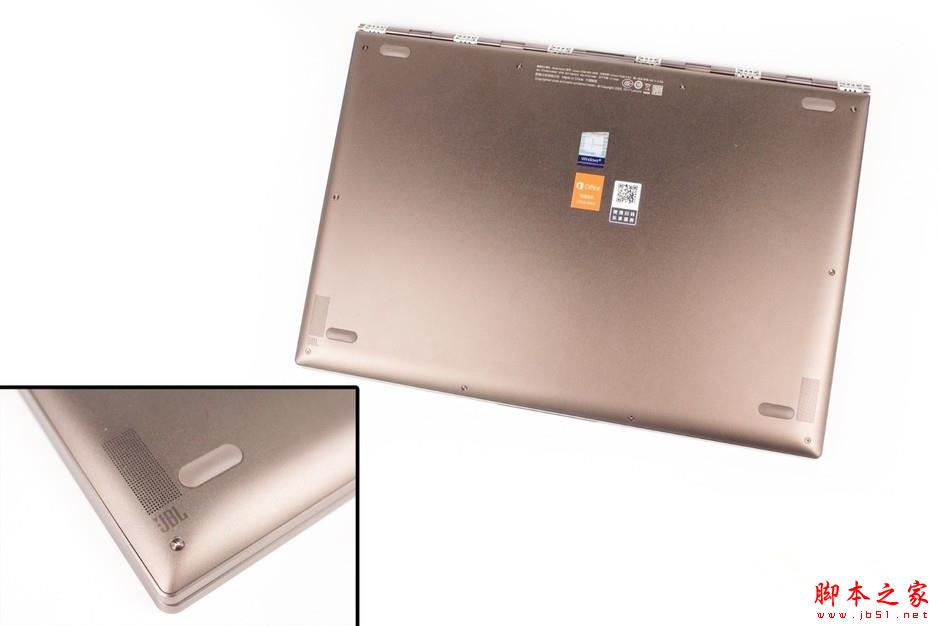 背面依舊是一整塊鋁合金板設計,由于YOGA 6 Pro采納隱藏式進出風設計,機身表面沒有任何散熱孔,也沒有任何為解決天線問題而開設的孔位,僅在下方的兩側有為JBL揚聲器開設的細孔。