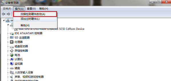 3、點擊操作之后,選擇掃描檢測硬件改動,系統會自動重新加載設備,如下圖所示:
