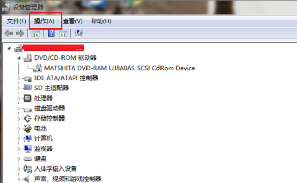 2、進去設備管理器之后,鼠標點擊在計算機名稱上,選擇操作,如下圖所示: