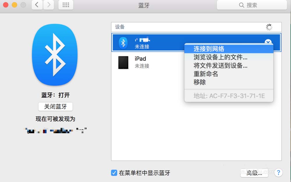 5、雙擊(右鍵)該藍牙連接,在彈出的右鍵菜單里,選擇‘連接到網絡’