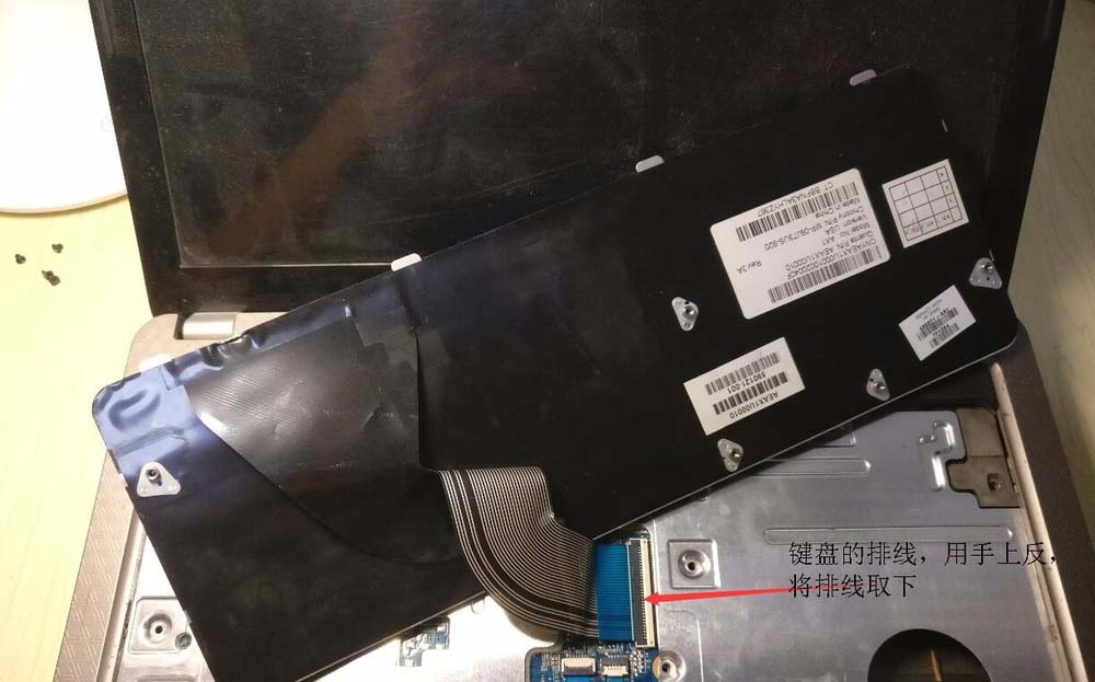 3、拆卸鍵盤,將電腦背面的螺絲全部拆卸,用手將鍵盤扣下來,會發現底下連有排線,將排線取下,鍵盤分離,進一步取下鍵盤下底板