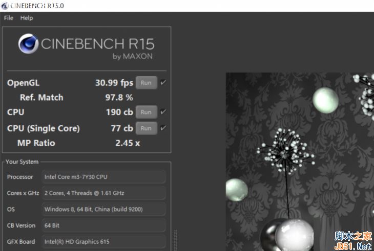 m3-7Y30基于Intel最新的Kaby Lake架構,14nm制造工藝,雙核心四線程的主頻為默認1.0GHz,睿頻可達2.6GHz。使用CineBench R15軟件測試,其最終單線程成績為77cb,多線程成績為190cb,對于一款TDP僅為4.5W的CPU來說還算理想。