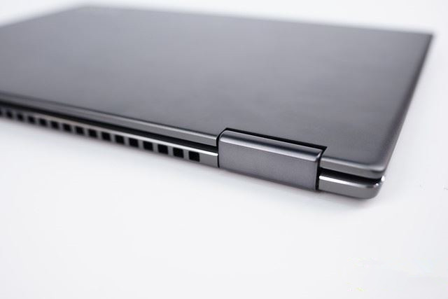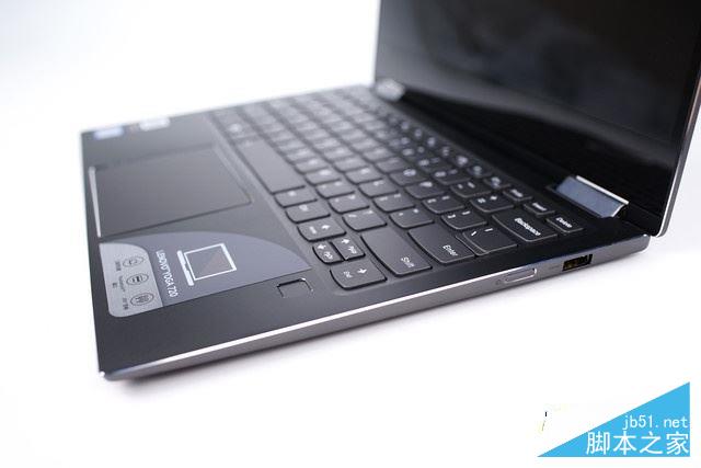 仔細看一下C面的設計,電容式指紋解鎖區域、觸控板邊框以及整個側面都擁有CNC工藝倒角十分漂亮,YOGA的logo也印刻在右下角。并且能夠看到機器右邊的電源鍵和一個USB接口。