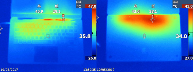 通過熱力圖我們能夠看出,三星星曜900X5N在滿負(fù)荷工作狀態(tài)下,正面45.9℃的最高溫度出現(xiàn)在了出風(fēng)口的右側(cè),背面的最高溫度為42.6℃,主要分布在機(jī)身進(jìn)風(fēng)口處。用戶在日常使用中,手掌和手腕部分是幾乎很難感受到筆記本帶來的熱量的,而且最高45.9攝氏度的監(jiān)測(cè)溫度說明星曜900X5N的散熱性能足夠優(yōu)秀了。