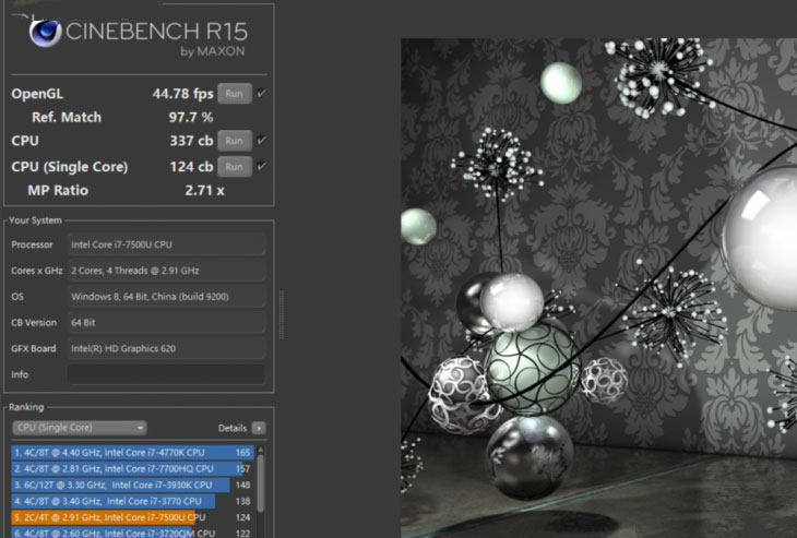 Intel Core i7-7500U是基于Kaby Lake架構(gòu)的,采用14nm制造工藝的雙核心四線程處理器,具有2.7GHz的默認(rèn)主頻,并且能夠睿頻到3.5GHz。三星星曜900X5N使用的這顆i7-7500U在《CineBench R15》測(cè)試環(huán)節(jié)中取得了多核心337cb、單核心124cb的好成績,出色的性能能夠輕松滿足用戶的日常使用。