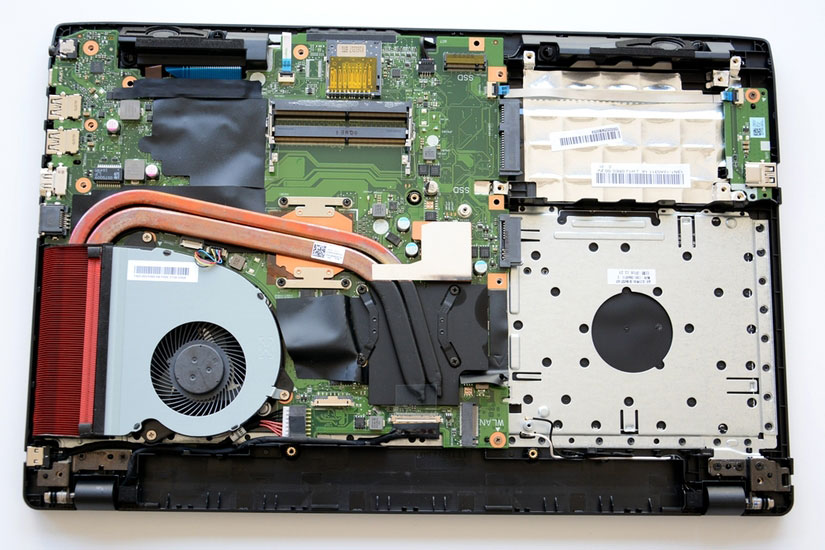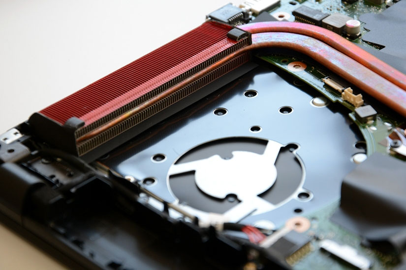 打開后蓋,內(nèi)部的配件、主板、散熱管都一覽無(wú)余了。第一眼看上去會(huì)以為很亂的樣子,實(shí)際上是用了很多的貼紙來(lái)保護(hù)配件,比如防塵、隔熱。