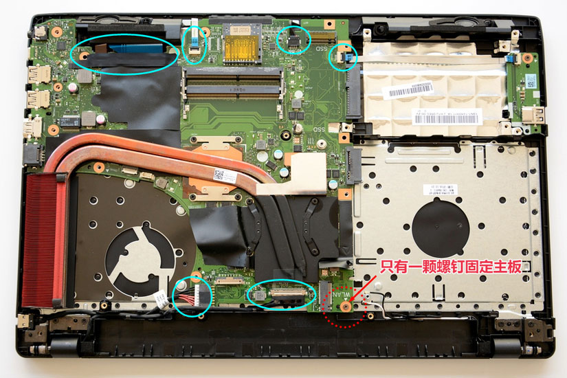 想要拆下主板,需要首先拆掉所有的連接線,無(wú)須記住位置,主要是注意別弄斷了,以及在安裝的時(shí)候要到位。主板只有一顆螺釘固定,而且是在無(wú)線模塊下面,所以一定要拆下無(wú)線。