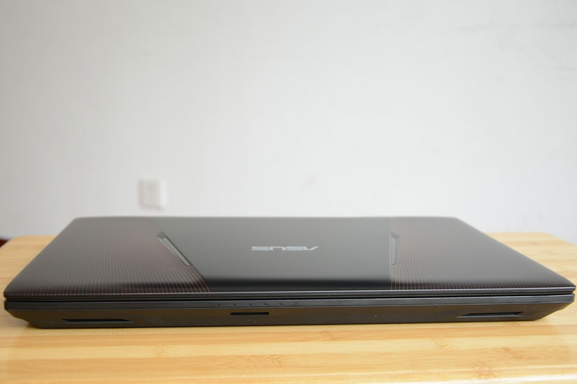 與其它型號(hào)不同的是,這款ZX53V系列在外觀上采用了黑紅搭配,在A面和鍵盤區(qū)設(shè)計(jì)了一些平行而不規(guī)則的暗紅色線條,這些線條看上去毫無(wú)疑問(wèn)給機(jī)器帶來(lái)了一些視覺(jué)沖擊。不過(guò)在整機(jī)模具方面,基本上沒(méi)有變化。A面手感鏡面,比較容易沾染指紋,也比較怕劃傷。