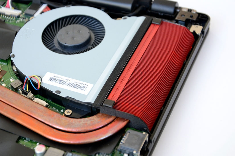 接下來(lái)是散熱系統(tǒng),先把風(fēng)扇拆下來(lái),渦輪風(fēng)扇,看著比較大,感覺(jué)很有力。實(shí)際測(cè)試效果也不錯(cuò)。紅色的散熱片比較密集,導(dǎo)熱銅管的用料也足。