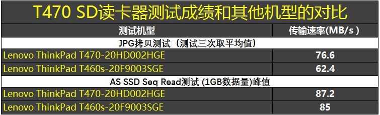 測試使用的SD卡是東芝的Exceria Pro SDXC 64 GB UHS-II,T470的SD卡讀卡器的最大傳輸率保持在90 MB /S(AS SSD測試結(jié)果),這是一個(gè)還算不錯(cuò)的成績。進(jìn)行照片(每張5MB,總共1GB大小)拷貝速度也達(dá)到77MB/s。