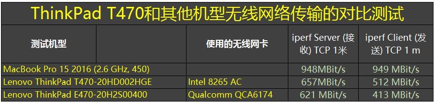 除了自帶的以太網(wǎng)卡(英特爾l19V),無線網(wǎng)卡性能也不差。T470配備的是英特爾8265AC無線網(wǎng)卡,支持2.4G和5G雙頻,最大傳輸速率為867Mbps,此外還支持802.11ac協(xié)議以及內(nèi)置藍(lán)牙4.2模塊,但是系統(tǒng)只支持到藍(lán)牙4.1。T470還有三頻WiFi選配網(wǎng)卡英特爾18265 AC,與ThinkPad WiDig Dock無線拓展塢相配套。在我們的測試中,英特爾8265AC這塊無線網(wǎng)卡下行速度能達(dá)到657Mbps,上行速度則為512Mbps,所以T470在無線網(wǎng)卡這塊是輕松超過E470。用不同路由器進(jìn)行了重復(fù)測試,結(jié)果大致相同,證明這塊網(wǎng)卡穩(wěn)定性很不錯(cuò)。