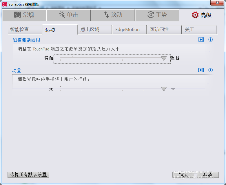 4、選擇“智能檢測欄”右側的“運動”,設置觸摸激活閥限為重觸