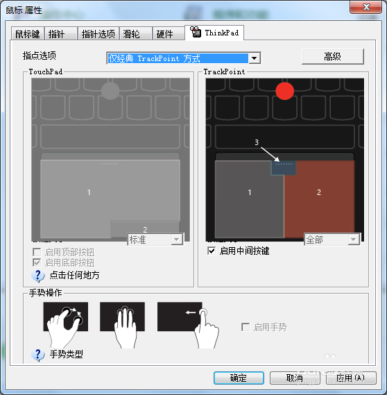 2、選擇 ThinkPad 選項卡,下拉框選擇僅經典 trackpoint 方式,進入高級選項;