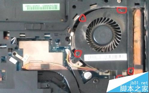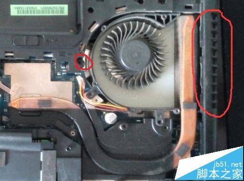 5、然后你也可以去拆下整個散熱模組。把圖中的CPU上面的散熱片的2個螺絲和小紅圈中的一顆螺絲就可以去掉整個散熱模組,但一般不推介拆卸,因為散熱硅膠會掉下來。